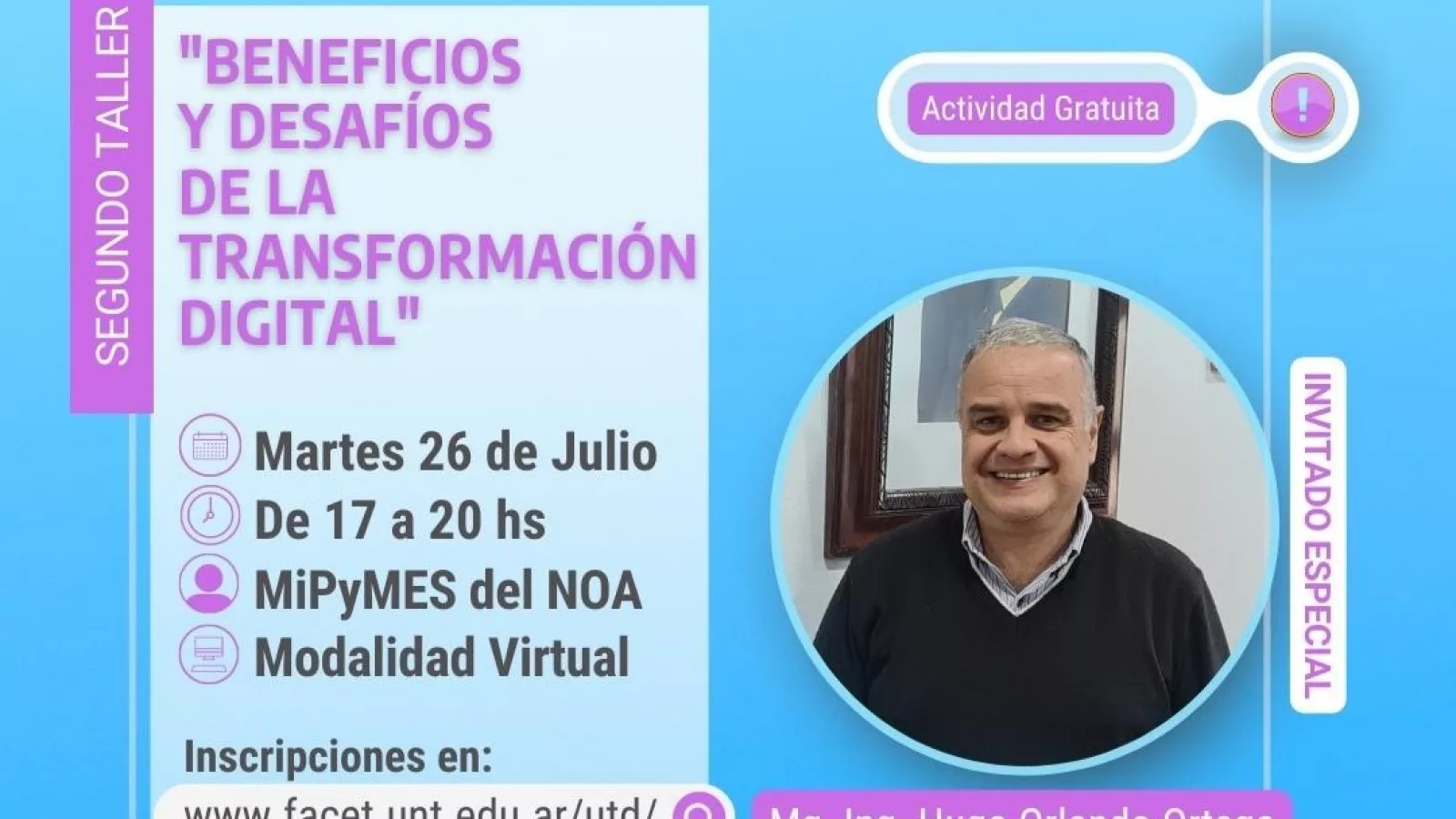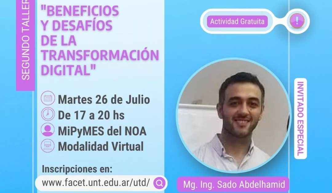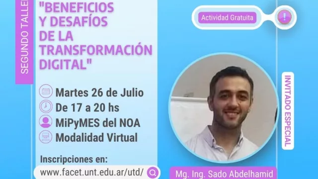 La Unidad de Transformación Digital de la Universidad Nacional de Tucumán continúa con sus actividades de capacitación. En esta ocasión, se llevará a cabo el taller “Beneficios y Desafíos de la Transformación Digital”, organizado por la Universidad Nacional de Tucumán y el Ministerio de Desarrollo Productivo de la Nación.