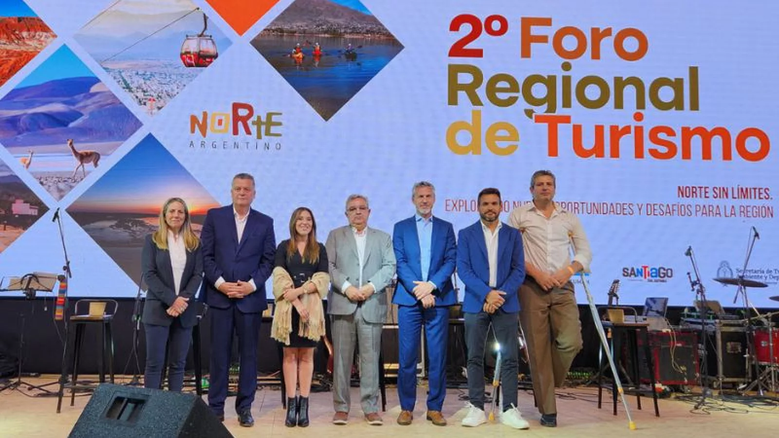 El primer mandatario local estuvo acompañado en el escenario por la ministra de Cultura, Turismo y Deporte catamarqueña, Daiana Roldán, la mencionada tucumana Inés Frías Silva, y los ministros de Turismo y Deportes de Salta, Mario Peña; de Cultura y Turismo de Jujuy, Federico Posadas; de Turismo y Culturas de La Rioja, Gustavo Luna; y el subsecretario de Turismo de Santiago del Estero, Nelson Bravo.