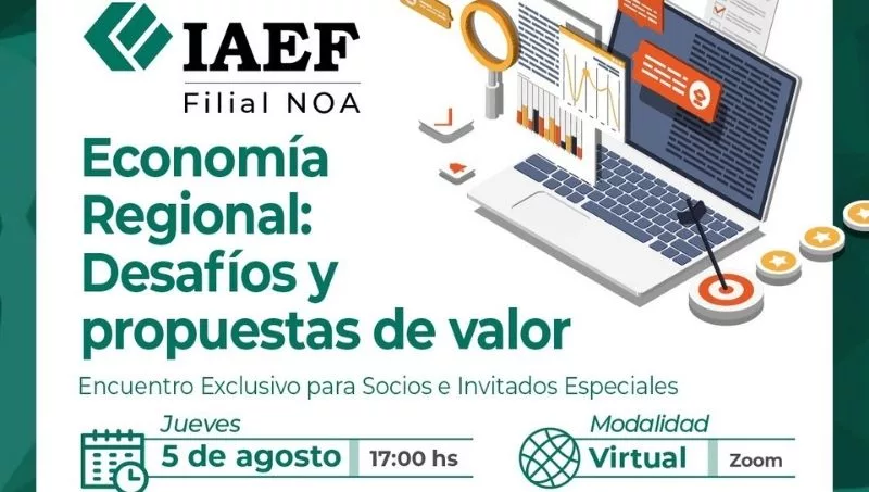 El Instituto Argentino de Ejecutivos en Finanzas Filial Noa llevará a cabo hoy 5 de agosto de 2021 un encuentro virtual en el marco del Ciclo de Actualidad y Coyuntura que abordará la temática, “Economía Regional: Desafíos y propuestas de valor”, a través de la plataforma Zoom. El encuentro iniciará a las 17 hs hasta las 18hs.