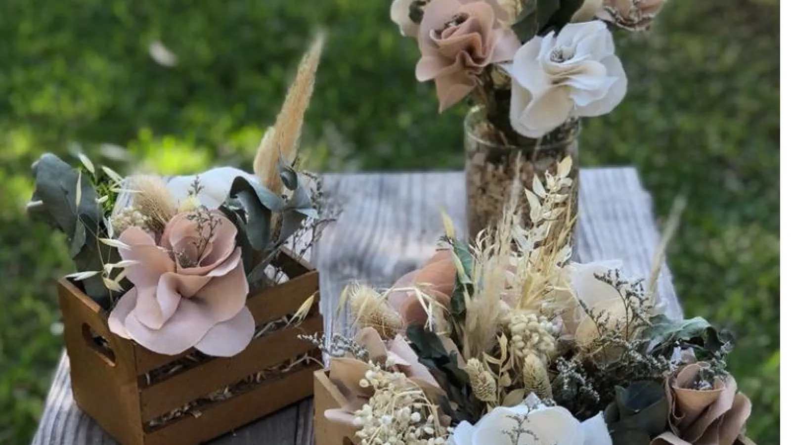 En Boeri’s Creaciones podrás solicitar centros de mesa, los cuales pueden ser en cajones y en floreros, con opciones en diferentes tamaños. También realizan arreglos florales en recipientes provistos por la gente. Otras opciones como ramos de novia, con flores de tela y follaje, ramos de distintos tamaños, con una variedad de flores. Cabe destacar que todos los ramos son personalizados por el cliente, es decir exclusivos, únicos.