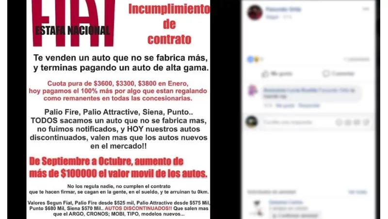 “Estafa Nacional Fiat: Incumplimiento de contrato, te venden un auto que no se fabrica más y terminás pagando un auto de alta gama. Todos sacamos un auto que no se fabrica más, no fuimos notificados y hoy nuestros autos discontinuados valen más que los autos nuevos en el mercado” reza una imagen publicada por un usuario en Facebook.