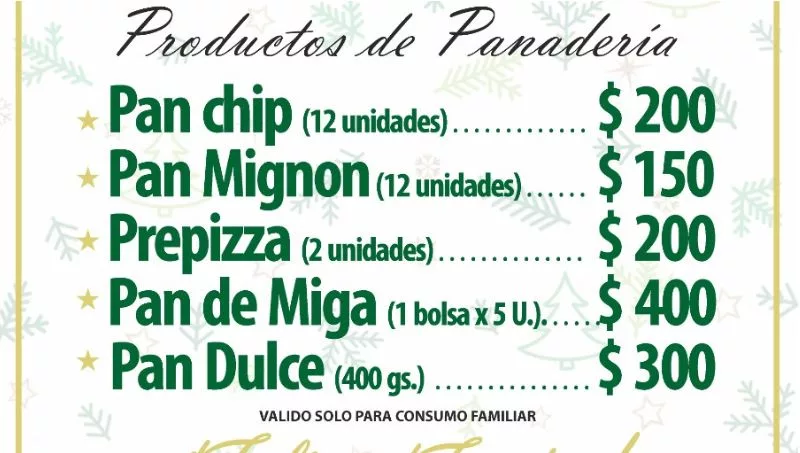 -Canasta Navideña de productos de panadería: Los precios acordados son: Pan chip por 12 unidades: $ 200; pan mignon por 12 unidades: $ 150; prepizza por dos unidades a $200; pan de miga (una bolsa con cinco unidades)a $ 400 y pan dulce de 400 gramos a $ 300.
