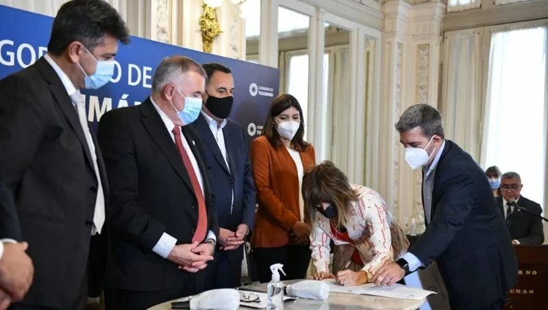 En un acto en el Salón Blanco de Casa de Gobierno, el gobernador Osvaldo Jaldo, firmó contratos de obra que tienen por objeto la construcción, habilitación y entrega de 135 viviendas para San Miguel de Tucumán y 132 para la comuna de Río Seco, en el departamento Monteros. Ambos proyectos representan una inversión total de $ 1.642 millones.