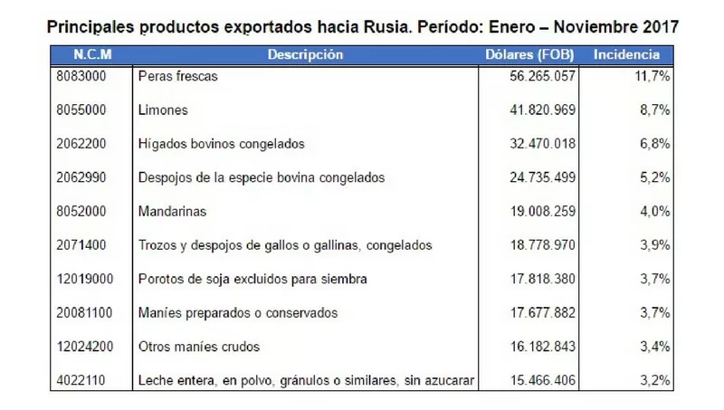 Un análisis de la Cámara Argentina de Comercio y Servicios (CAC) muestra que, en los primeros once meses de 2017, las exportaciones de Argentina hacia Rusia fueron de US$ 480 millones, lo que marcó un incremento de 5% respecto a igual período de 2016. Entre los principales productos exportados se encontraron las peras frescas (11,7% del total) y los limones (8,7%).
