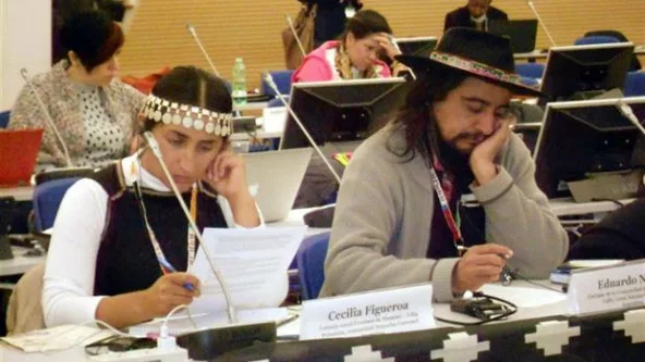 Asistieron al Foro de Pueblos Indígenas Eduardo Nieva, cacique de la comunidad Amaicha del Valle, que conforma el pueblo de la Gran Nación Diaguita, según explicó, y Cecilia Figueroa, de la comunidad mapuche Currumul, paraje Quillén, del departamento de Aluminé, representante del consejo zonal Villa Pehuenia, de la provincia de Neuquén.