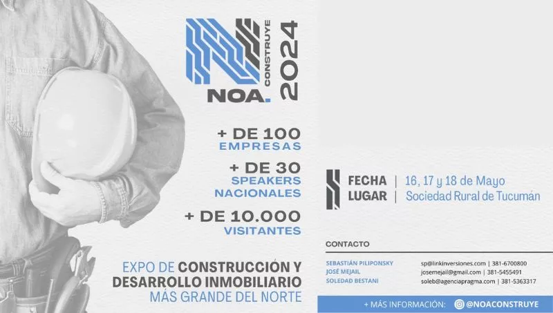 NOA Construye 2024 es el evento empresarial más grande del sector de la construcción, desarrollo y comercialización inmobiliaria en el Norte Argentino, el cual se llevará a cabo el 16,17 y 18 de mayo de 2024, en la Sociedad Rural de Tucumán.