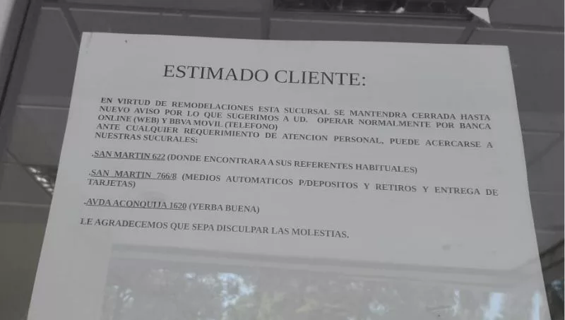 “Estimado cliente, en virtud de remodelaciones, esta sucursal se mantendrá cerrada hasta nuevo aviso por lo que sugerimos a Ud. operar normalmente por Banca Online (web) y BBVA móvil (teléfono).