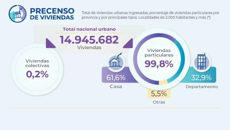 Mediante el Precenso de Viviendas realizado por el INDEC, plasmado en un mapa interactivo, se pudo conocer la distribución y el porcentaje de viviendas particulares por tipo en áreas urbanas de cada provincia argentina, departamento, partido o comuna. Esta nueva herramienta estará disponible para que cualquier ciudadano la consulte, y la misma se irá actualizando con nuevas capas de información. Un dato llamativo: la provincia de Santa Fe -con una población de aproximadamente 3,3 millones- tiene 243.334 viviendas más que la provincia de Córdoba, la cual tiene 3,5 millones de habitantes.