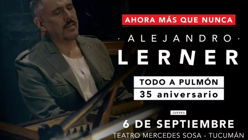 Reviví el histórico concierto de "Todo a Pulmón", el disco que consagró a Alejandro Lerner en el firmamento musical argentino y que lo estará reviviendo este 6 de septiembre en el Teatro Mercedes Sosa de nuestra capital. Las entradas ya se encuentran a la venta y en una excelente promoción, Banco Macro y Banco Tucumán ofrecen la posibilidad de financiar la compra hasta en 6 cuotas sin interés con todas las tarjetas de su grupo.