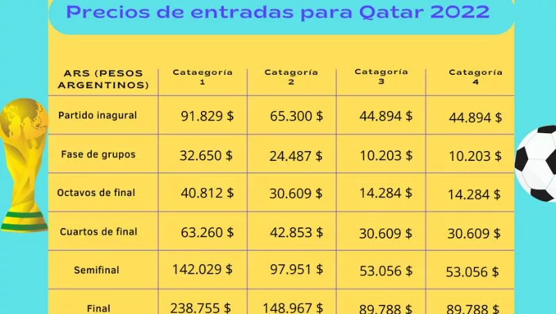 A octubre, el Salario Mínimo, Vital y Móvil (SMVM) en Argentina 2022 es de $ 54.550, el que asciende en noviembre a $ 54.900, eso significa que un argentino debería ahorrar alrededor de 20 SMVM para poder costear todos esos gastos para presenciar y alojarse toda la fase de grupos.