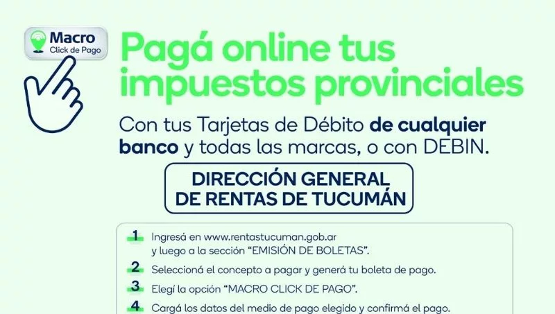De esta forma, la Dirección General de Rentas de Tucumán se suma a otros Organismos que ya operan con Macro Click de Pago como: Instituto Provincial de Vivienda y Desarrollo Urbano, Municipalidad de Tafí Viejo, Municipalidad de Banda del Río Salí y la DIM de la Municipalidad de San Miguel de Tucumán, IPSST y el IPLA.