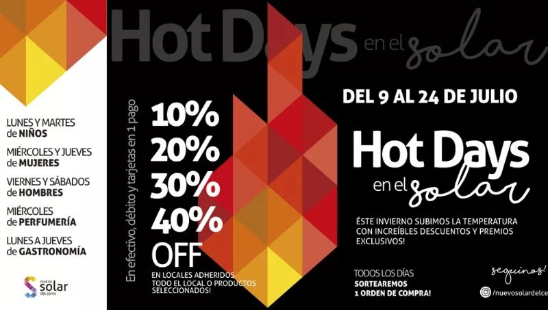 Los “Hot Days” comenzaron el 9 de julio y tenés tiempo hasta el 24 de este mes para aprovechar los descuentos en las mejores marcas. Los lunes y martes hay descuentos para el sector de niños, miércoles y jueves para mujer y viernes y sábados para hombre. Cabe destacar que, los días miércoles hay promociones de perfumería y los días lunes y jueves en Gastronomía. Además el shopping realizará sorteos por órdenes de compra de $5000 todos los días entre sus clientes que compren en el paseo comercial.