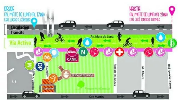 El programa se desarrollará los domingos y contempla el corte de tránsito vehicular a lo largo de la avenida Mate de Luna, desde la calle Lucas Córdoba hasta Thames. Se trata de 1.500 metros (de ida y vuelta en la avenida) en los que podrán confluir peatones, ciclistas, patinadores, deportistas, niños en triciclos, personas en sillas de ruedas, entre otros grupos familiares.